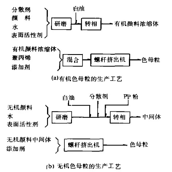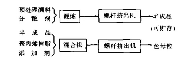 所用生產裝置投資較低,使用的多為廉價顏料,故成本較低。這種生產方法在一些小型的色母粒生產廠家中較為常見。但該法的弱點在于不能將顏料充分細化處理,顏料粒度達不到要求,所以制得的色母粒僅能應用在 注塑等對顏料粒度要求不高的領域。在聚丙烯纖維的生產中只能應用于部分地毯絲等粗旦纖維中。