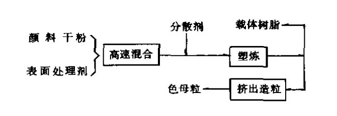 這種色母粒生產所使用的顏料必須經過顏料細化和表面處理 ,制得的色母粒才能具有好的內在質量。這種生產方法的優點是流程簡單,見圖 2 。設備固定投資少,缺點是可供選擇的顏料不全面。生產的靈活性受到了限制,而且對顏料的粒度不能控制 。